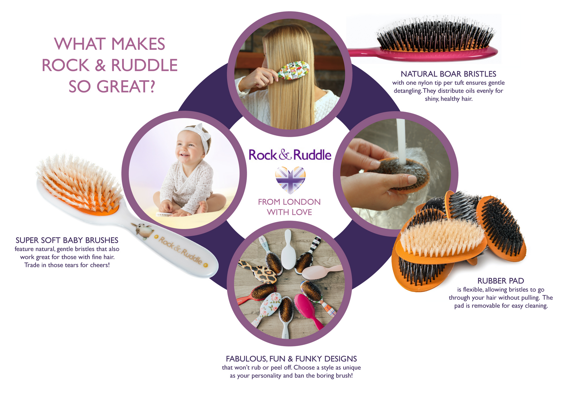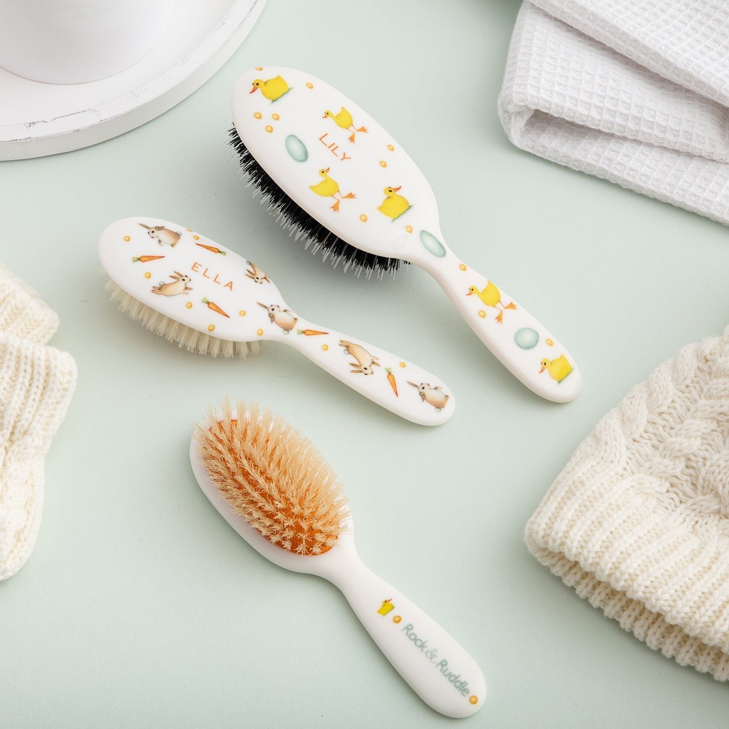 Rock & Ruddle hairbrushes have the best quality natural bristles that glide through your hair without pulling or hurting, leaving it smooth and shiny. They are fantastic paddle style brushes amazing for detangling and smoothing and they work on straight hair, curly hair and even on hair extensions. There are bristle choices to suit everyone, adults and children alike and there is even a very soft bristle for babies. In fact they are perfect for all hair types. Hair stylists also love our hairbrushes and combs. You can even remove the bristle pad to give it a great clean. Please see our additional information. This Clare Mackie design featuring the most adorable little brown rabbits and delicious orange carrots appeals to everyone and is reminiscent of the amazing and very English stories of Peter Rabbit that we all love, by Beatrix Potter. This small brush is perfect for travelling and fits neatly into a baby's accessories bag or a handbag.