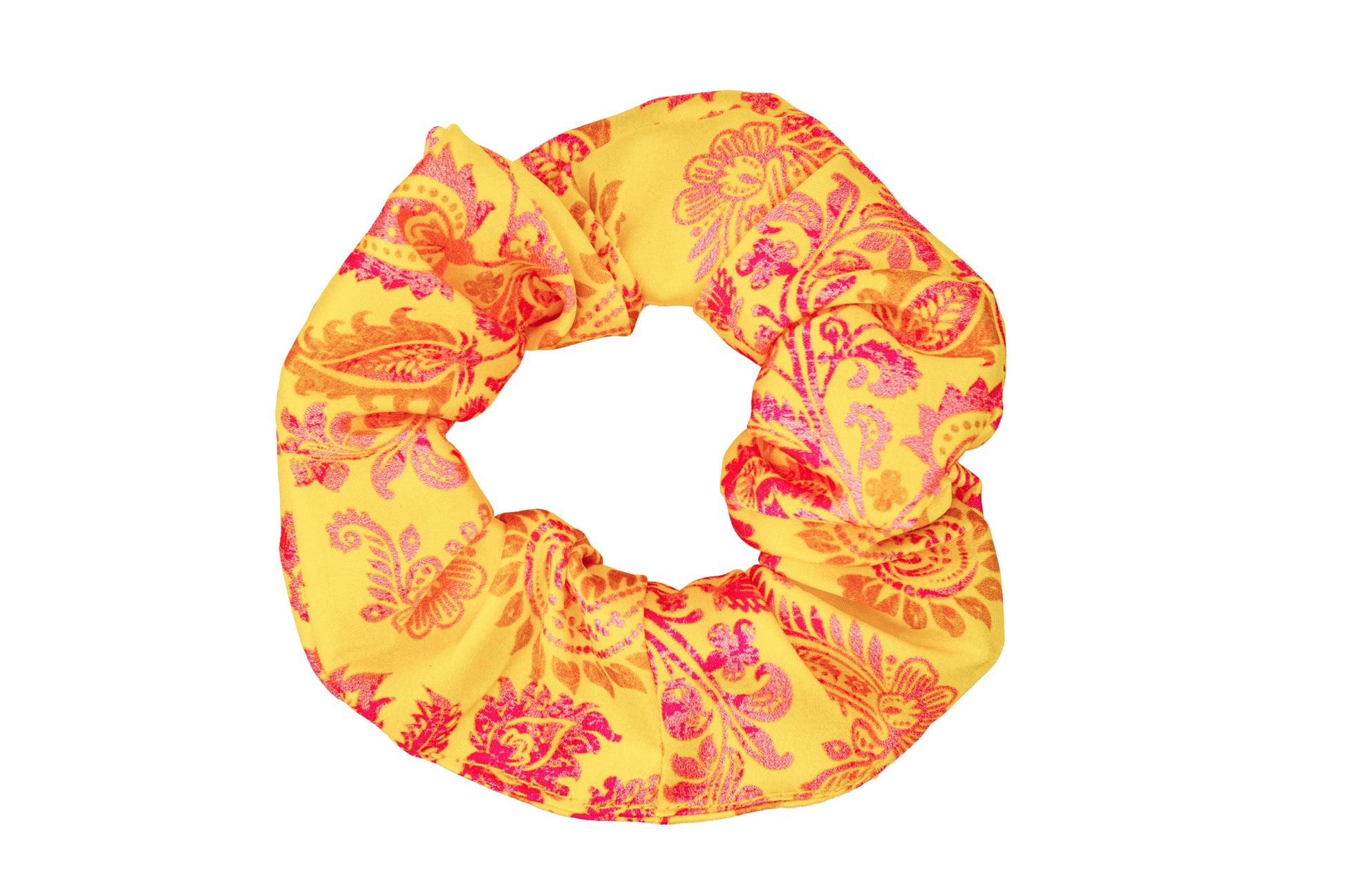 Bring the sunshine with you wherever you go with our Saffron Swirl Scrunchie. Bursting with gorgeous saffron yellow and hot pink paisley swirls, this statement hair accessory adds instant colour and character to your style.