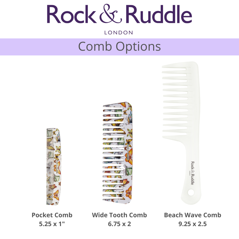 Combs are an essential tool in styling and detangling hair. Rock & Ruddle offers a lovely collection to suit any hair type and personality. On this website, you can choose from a Wide Tooth Comb, a Pocket Comb (both of which come in several design choices) or our largest comb, the Beach Wave Comb.